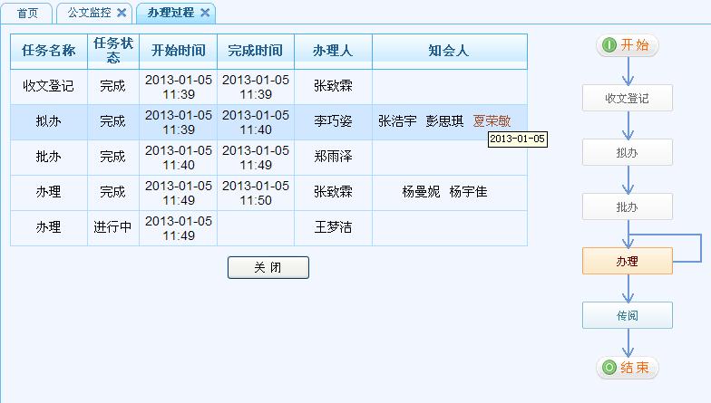 单击公文操作区域的“过程”,显示公文公文的整个批阅过程,包括任务名词、任务状态、开始时间、完成时间、办理人以及每个步骤的知会人(可根据颜色的不同来区分知会人是否已阅,当鼠标放在人名上显示知会人查看知会公文的时间)。
